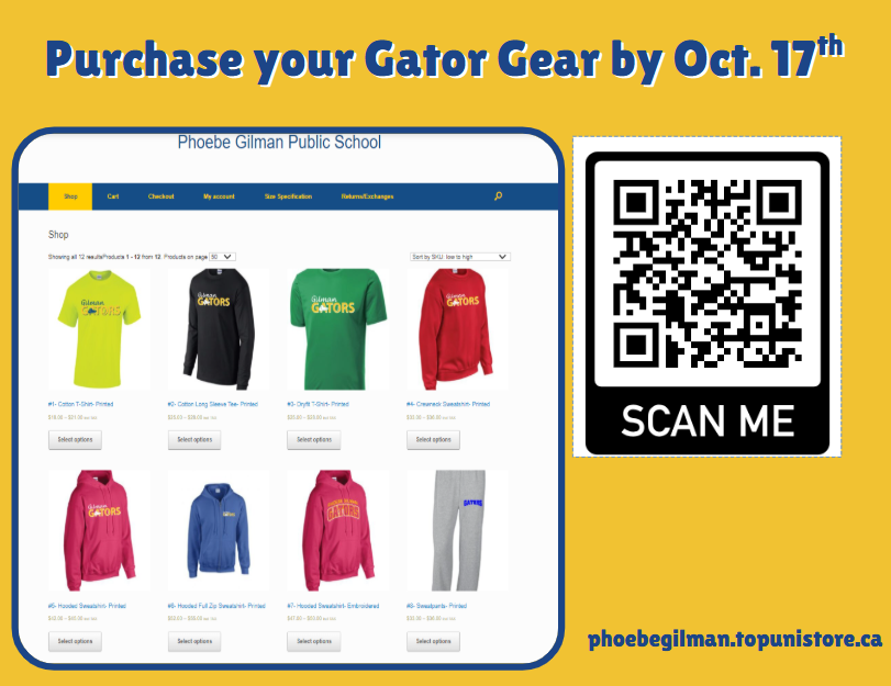 We are offering Phoebe Gilman Gator gear (clothing with our school logo). Take a look at our online store to place an order. Select ship to school for free shipping. We have t-shirts, long-sleeved shirts, hoodies, shorts, sweatpants, and winter hats. https://phoebegilman.topunistore.ca/. The online store closes on Oct. 17 and orders will be delivered in early November.